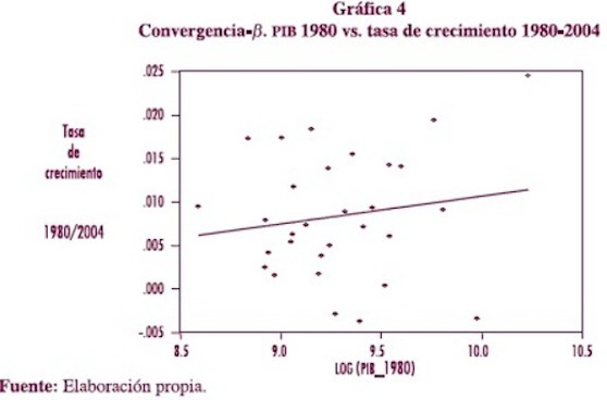 Se espera que la relación entre el nivel inicial del pib per capita y la tasa anual de crecimiento en el periodo sea negativa, indicando esto que efectivamente las economías pobres crecen más rápido que las economías más ricas, o que la distribución del pib per capita se compacta cuando hay convergencia-β. Lo que se puede observar en la gráfica 4 es que ocurre exactamente lo contrario, la relación entre el pib per capita inicial y la tasa de crecimiento de las entidades federativas en el periodo 1980-2004 presenta una tendencia positiva, lo cual permite afirmar no que hubo convergencia-β.