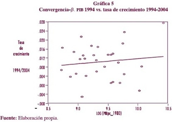 La relación positiva entre el nivel inicial de pib per capita y la tasa de crecimiento de nuestro grupo de economías se mantiene para el periodo posterior a la liberalización del comercio. El proceso de divergencia es una característica del crecimiento económico en México. No se han presentado mecanismos o factores que contrarresten los efectos del cambio de modelo de desarrollo, de la crisis de 1995 y de la desaceleración económica experimentada en el año 2001.