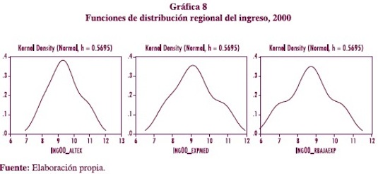 Ahora podemos utilizar los datos de ingreso construidos en el apartado previo para estimar la distribución regional del ingreso. Estimamos una función de densidad (Silverman, 1986) tipo Gauss-kernel, que viene expresada de la siguiente forma: