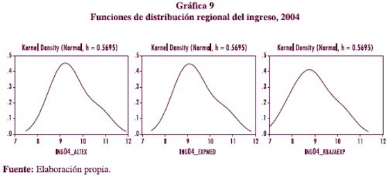 La gráfica 9 muestra las funciones regionales de distribución del ingreso en el año 2004. La región AEG tiene una moda en $12,058 que indica el promedio de ingresos. La región EMG tiene su moda en $8,955 y la región BEG en $6,634. El ingreso de las tres regiones aumentó entre los años 2000 y 2004. Gráficamente las funciones se han desplazado a la derecha sobre el eje que representa el nivel de ingreso. La región que presentó un incremento mayor en su ingreso promedio fue la AEG ($1,150 entre 2000 y 2004) seguida por la región EMG ($851) y por la región BEG ($631). La concentración parece haber disminuido en las tres regiones, pues se ha ensanchado el área que se encuentra próxima al valor de la moda en los tres casos.