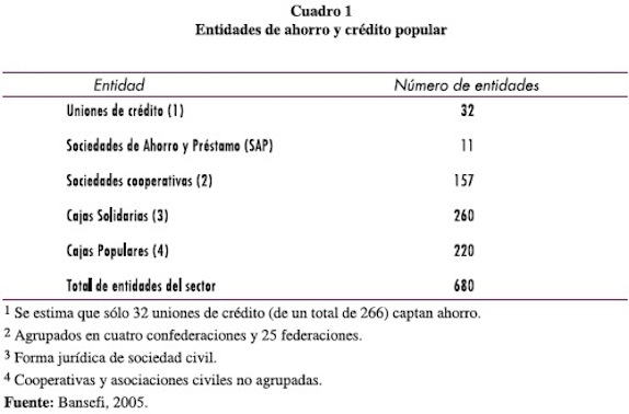 Lo anterior da como resultado un sector de banca social, como se ha dicho, disperso y con fines a veces abiertamente contrapuestos como puede tenerlos un banco comercial o una institución microfinanciera de combate a la pobreza. El cuadro 1 da muestra del tipo de instituciones del llamado sector de banca social. Algunos analistas (Illanes, 2005) llegan al extremo de hacer sus propias categorizaciones ante las que no existe ningún consenso entre los estudiosos, llamando al sector de uniones de crédito, sociedades de ahorro y préstamo, sociedades cooperativas, cajas solidarias y cajas populares, como banca popular y al de IMF como banca social.