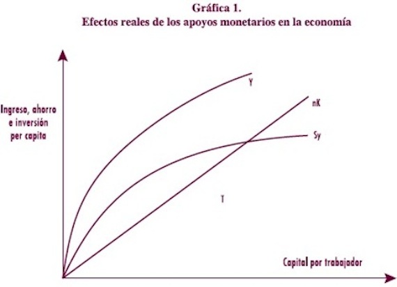 aumenta los recursos disponibles. Este incremento de recursos elevará la tasa de inflación (p), reduciendo la demanda de saldos monetarios reales (Md) y subiendo la proporción de la inversión productiva dentro del ahorro real.