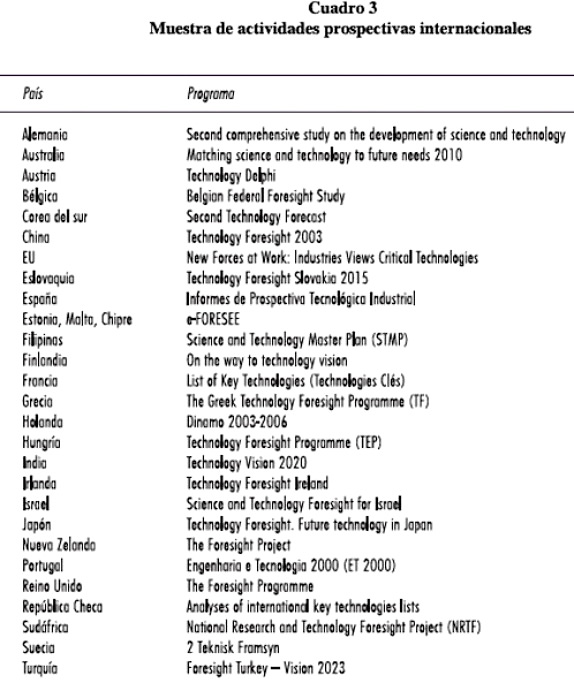 En países hispanoparlantes, al igual que en el resto del mundo, ha proliferado la actividad prospectiva. En América Latina y Caribe, ésta ha sido promovida principalmente por la ONUDl6 y el nodo latinoamericano del Millenium Project de la ONU. Sin embargo, existen otras actividades cercanas a la prospectiva paralelas a los desarrollos realizados por estas entidades supranacionales en América Latina y Caribe, como los de Argentina, Bolivia, Chile, Colombia, Costa Rica, Uruguay y Venezuela (Rodríguez et al., 2000). En España, el centro de la actividad prospectiva es el Observatorio de Prospectiva Tecnológica Industrial (OPTI) (OPTI 1999, 2000, 2001). Otros estudios que han abordado tendencias tecnológicas futuras y su impacto en la sociedad española con un enfoque prospectivo son los informes anuales de la Fundación Cotec (i.e. 2002, 2003), y de la fundación Telefónica (i.e. 2002, 2003), entre otros (Héraud y Cuhls, 1999; Mañá, 2001).