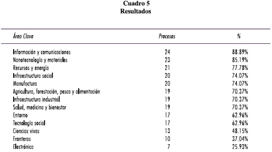 Como resultado del análisis se deduce que la "Información y las comunicaciones", "Nanotecnología y materiales", "Recursos y energía" y "Salud, medicina y bienestar", entre otras (cuadro 5), son consideradas como áreas estratégicas para el desarrollo económico internacional. Estos resultados han de ser interpretados en sentido amplio, pues cada país prioriza su esfuerzo en investigación e inversión en función de su posición competitiva, así como de su papel en la economía internacional. No obstante, se puede interpretar que existen áreas clave transversales a cualquier economía en un contexto global.