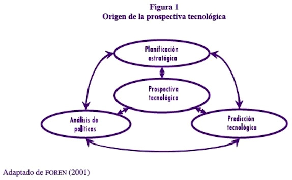 El origen de la prospectiva tecnológica (FOREN, 2001:5) se sitúa en la convergencia entre la planificación estratégica, la predicción tecnológica y el análisis de políticas (figura 1).