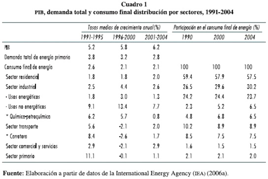 El análisis de la dinámica económica y social aporta los principales argumentos que explican los rasgos de continuidad del sistema energético tradicional y también los cambios que han sucedido en la última década y media. Si se comienza por los elementos de continuidad, el hecho de que el crecimiento económico esté sostenido por los servicios explica que el consumo energético presente una baja elasticidad-ingreso, pues las actividades terciarias que se han mostrado más dinámicas son escasamente intensivas en energía, lo mismo que las manufacturas tradicionales que más han crecido, las cuales se hallan pobremente mecanizadas. El menor crecimiento de las industrias de bienes de equipo junto al precario estado del transporte y otras infraestructuras hacen que tampoco aumenten con rapidez las producciones intermedias que son más intensivas en energía, como la siderurgia, el cemento, la metalurgia no ferrosa y la química industrial. El escaso parque de vehículos limita drásticamente el consumo de derivados de petróleos utilizados como combustibles.