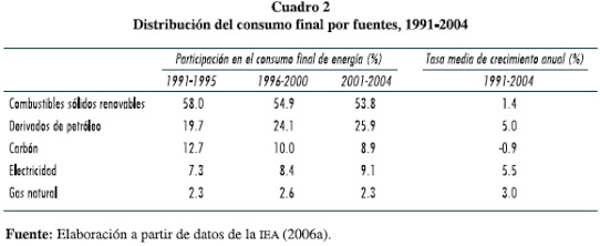 Por tanto, al considerar el comportamiento de los sectores de consumo, es lógico que la intensidad energética haya descendido, pues, sea por sus características (servicios e industrias ligeras) o por su infradesarrollo (ramas de bienes de equipo e intermedias, transporte, hogares urbanos), ninguno de los sectores finales presenta una elasticidad significativa con respecto al crecimiento del PIB. Y, a la vez, los niveles que registra la intensidad energética siguen siendo altos porque las actividades productivas y domésticas que realizan ese consumo son bastante ineficientes y siguen utilizando recursos energéticos de baja calidad.