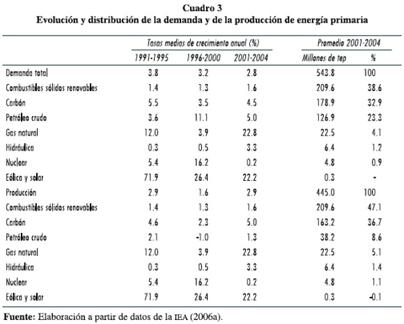 e) La demanda total de energía primaria (DTEP) se ha visto más estimulada por el consumo intermedio que por los sectores finales. A pesar de ello, su tasa media de crecimiento (3% anual) es casi la mitad de la registrada por el PIB (5.8%) en el intervalo 1991-2004 y el nivel que alcanza en el último año (573 millones de tep) sigue siendo modesto. Por ejemplo, apenas equivale a la tercera parte de la DTEP de China, cifrada en 1,600 millones de tep. La composición de la demanda refleja una presencia del carbón (33%) muy superior a la que tiene en el CFE, debido a su gran participación en la generación de electricidad. Sin embargo, el principal recurso sigue siendo el empleo de combustibles sólidos renovables que todavía mantienen una cuota cercana a 40% de la DTEP (cuadro 3).
