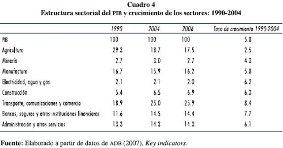 En apenas década y media la estructura del PIB ha experimentado una fuerte convulsión (cuadro 4). La agricultura ha perdido casi 12 puntos, ganados por los servicios, en particular comercio, transporte y comunicaciones (siete puntos) y finanzas (tres), mientras que el sector industrial sólo ha elevado un punto su contribución gracias a la construcción. Resulta sintomático de las características actuales de la economía hindú el hecho de que en un contexto de fuerte crecimiento de la economía las manufacturas no hayan modificado su (débil) aportación, que se mantiene en torno a 16% del PIB.