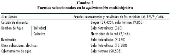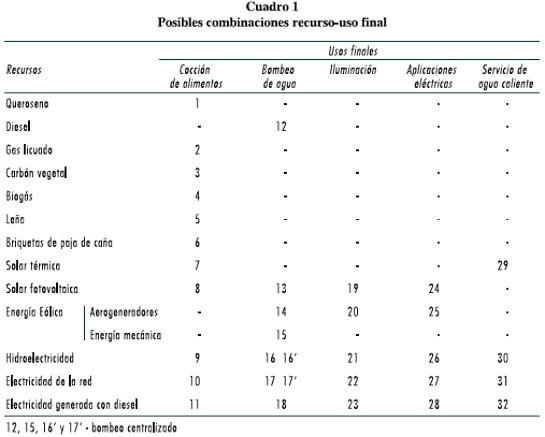 Los usos finales de la energía necesarios en la comunidad son cocción de alimentos, bombeo de agua, iluminación, aplicaciones eléctricas y servicio de agua caliente; los recursos con los que se podía contar para satisfacer dichos usos son queroseno, diesel, gas licuado, carbón vegetal, biogás, leña, briquetas de paja de caña, energía solar térmica, energía solar fotovoltaica, energía eólica, hidroelectricidad, electricidad de la red y electricidad generada con diesel. Con estos elementos puede conformarse una matriz de recursos -usos finales o matriz de decisión, la cual se muestra en el cuadro 1-. Como puede observarse resultaron 32 combinaciones posibles que representarían variables de decisión del problema planteado.
