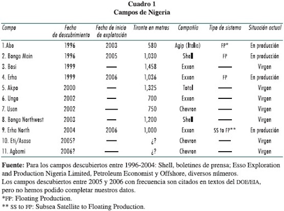 3 "Exploration and appraisal began in 1995 and several discoveries have been made in Nigeria's deepwater although high costs associated with deep water have meant that production has been delayed", tomado de "Nigeria oil and gas: crude petroleum and natural gas extraction. Overview" (www.eia.doe.gov/emev/cabs/ecowas/pdf.pdf).