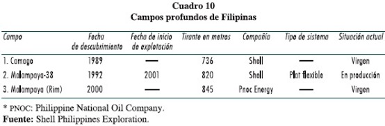 Es un país importador neto, en el que los ingleses de Shell han incursionado en aguas profundas desde finales de los años ochenta. En 2001 se inició la producción de gas en el campo Malampaya.21