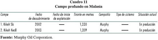 También en este país la incursión a las aguas profundas apenas se inició. En 2002, la Murphy Oil Corporation, pequeña empresa estadounidense, realizó el primer descubrimiento, el campo Kikeh, anunciado como un "tremendo éxito".22 Un año después se descubrieron extensiones del mismo lugar. Iniciaron operaciones a finales de 2007, con una producción de 100 mil barriles diarios, lo que es un dato suficiente para reconocer a Kikeh como un nuevo campo gigante.