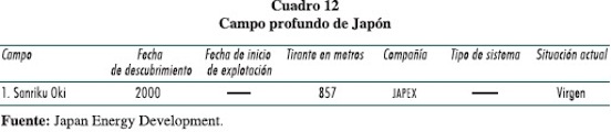 En este país las actividades en aguas profundas son recientes. Frente a las islas Hokkaido se descubrió el único campo; las pruebas de producción fueron exitosas pero las nuevas perforaciones para delimitar el yacimiento fracasaron. No obstante los contratiempos, el Japan Energy Group (JAPEX) afirma en un reporte que continuará la exploración con sísmica 3D y otras técnicas avanzadas.24