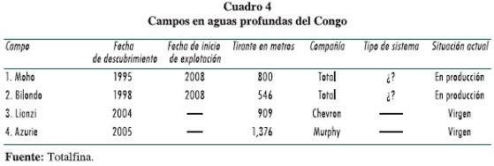 En este país también nos encontramos con campos marinos profundos que a pesar de haber sido descubiertos desde los años noventa apenas han iniciado operaciones. La francesa Total anunció el pasado 28 de abril de este 2008 que el complejo Moho-Bilondo comenzó a producir.11 La operadora destacó una reducción del ciclo entre el descubrimiento y el arranque de la producción. Explicó que aunque el campo fue descubierto en 1995 y transcurrieron 13 años de espera, "una vez firmado el contrato, sólo transcurrieron 33 meses para el diseño, construcción e instalación de los equipos, incluyendo el tendido de un oleoducto de 80 kilómetros de largo y 16 pulgadas de diámetro, que trasladará el crudo a la terminal de exportación en la costa.12 Se espera que la producción se eleve hasta 90 mil barriles diarios, cifra exagerada si se considera el modesto volumen de reservas estimado para los dos campos, ahora unificados para su explotación, según Offshore, de 240 millones de barriles.13