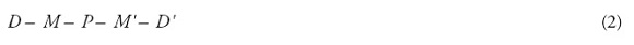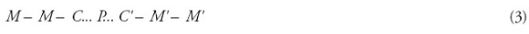 En (2), P representa el proceso productivo, My M'representan mercancías, D denota la función de dinero como capital (capital dinerario) y, además, D' > D.
