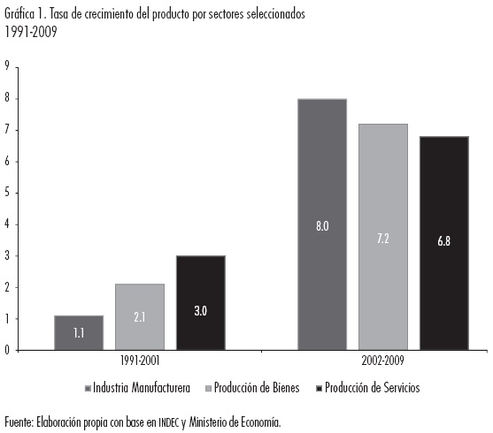Como se puede observar, los cambios entre el régimen de Convertibilidad y la etapa post-Convertibilidad son sustantivos. El periodo 2003-2009 no sólo exhibe mayores tasas de crecimiento promedio, sino que además los motores de la expansión se encuentran vinculados a la producción de bienes, en particular a la industria manufacturera.8 En lo que respecta al sector servicios, que constituía el sector más dinámico durante la década del noventa, si bien crece a tasas que duplican el ritmo de expansión promedio que mostraron en la Convertibilidad, su importancia relativa cambia radicalmente, ya que en la década actual pasa a ser el sector que menos crece.