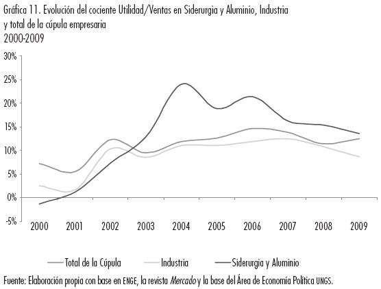 La Gráfica 11 muestra la evolución del cociente utilidad sobre ventas para la actividad Siderurgia y Aluminio, para el sector industrial en su conjunto y para el total de la cúpula empresaria. Como puede observarse, hasta la devaluación del peso el margen de rentabilidad sobre ventas de la actividad se encontraba en niveles inferiores a los del conjunto de la actividad industrial, y muy por debajo del promedio de la cúpula empresaria. A partir del año 2002, sin embargo, la rentabilidad en la actividad siderúrgica muestra un fenomenal incremento. Mientras en el año 2001 el ratio utilidad sobre ventas para el promedio de las empresas siderúrgicas que integran la cúpula industrial apenas superaba el 1%, ya en 2003 era del 12.9%, alcanzando un pico de 24% en el año 2004 y consolidándose en niveles muy elevados durante los años siguientes. Esta dinámica muestra que en la nueva etapa post-Convertibilidad, la rentabilidad sectorial se recompuso notablemente, explicada por una enorme caída en el costo salarial y un continuo aumento de la productividad. Esta evolución creciente de la tasa de utilidad sobre ventas fue acompañada además por una sustancial expansión del volumen de ventas del sector, que se incrementó casi treinta veces entre 2000 y 2008. Es decir, considerando tanto la evolución de las ventas como del margen de rentabilidad, a partir de la devaluación las empresas siderúrgicas se transformaron en uno de los sectores con mejor desempeño dentro de la cúpula industrial.