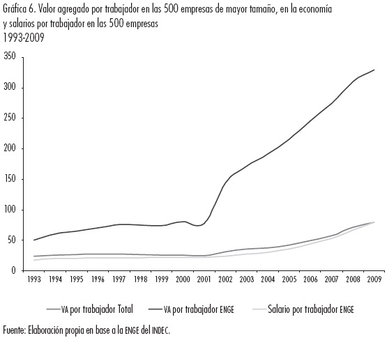 Esta evolución de los salarios y las utilidades evidencia que la crisis de la Convertibilidad y la posterior devaluación trajeron aparejada una enorme redistribución de los recursos generados por la cúpula empresaria, en un contexto de notable aumento del valor agregado de las principales empresas. Dicha tendencia puede explicarse a partir de analizar la evolución del valor agregado por trabajador en las 500 grandes empresas y compararlo con la evolución del salario promedio por trabajador en esas firmas.