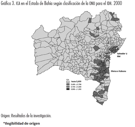 Se puede observar todavía que la microrregión de Ilhéus-Itabuna presenta un aglomerado de municipios con ICA superior a 0.5. Es importante considerar que esta microrregión tiene una mono cultura de cacao de gran importancia económica, y los cacahueros hacen uso muchas veces de las sombras provenientes de la vegetación nativa de la Mata Atlántica. Además de eso, esta microrregión posee significativa cantidad de parques estaduales y reservas indígenas y es una región costera con nivel de urbanización menor que la Región Metropolitana de Salvador.