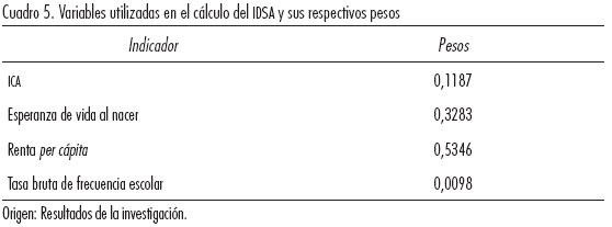 en que el IPDSA es el Índice Parcial de Desarrollo Socioeconómico Ambiental asociado al i-eximo municipio en cuestión; Fij son los escores factoriales estimados según el procedimiento de descomposición de componentes principales. El análisis factorial fue conducido para los siguientes indicadores: Esperanza de Vida al nacer (EV), Renta Per Cápita (RPC), Tasa Bruta de Frecuencia a la Escuela (TXESC) e Índice de Condiciones Ambientales (ICA).