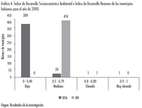 El Índice de Desarrollo Socioeconómico Ambiental construido presentó una media de 0.28, lo que permitió concluir que las condiciones ambientales de los municipios estudiados constituyeron un factor reductor del nivel de desenvolvimiento humano, ya que el IDH tradicional clasifica la mayoría de los municipios bahianos en el intervalo de 0.5 a 0.79.