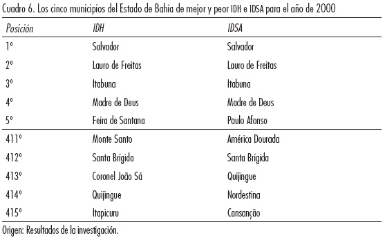 Los cuatro mejores municipios bahianos clasificados en el IDH también fueron clasificados por el IDSA: Salvador, Lauro de Freitas, Itabuna y Madre de Deus. Los dos primeros poseen un buen rendimiento para el indicador de renta. Ya para los municipios de Itabuna y Madre de Deus, el ICA y la Esperanza de Vida al nacer explican su sustentación en el tercer y cuarto lugar, respectivamente. No obstante, el municipio de Feira de Santana fue superado por Paulo Afonso, justamente por presentar este último un ICA más elevado (Cuadro 6).