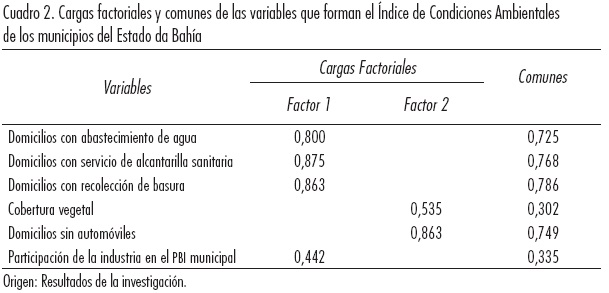 en que IPCA. es el Índice Parcial de Condiciones Ambientales asociado al i-eximo municipio de Bahía, y F„ son los puntajes factoriales estimados, conforme el procedimiento de los componentes principales. El análisis factorial fue conducido por indicadores presentados en la fuente de datos, con excepción de las variables, renta per cápita; esperanza de vida al nacer y frecuencia a la escuela que fueron utilizadas para la construcción del Índice de Desarrollo Socioeconómico Ambiental (IDSA). De este modo, se utilizaron los siguientes indicadores: (X1) personas que viven en domicilios con recolección de basura; (X2) personas que viven en domicilios con agua corriente; (X3) personas que viven en domicilios que poseen red general de alcantarilla o pluvial; (X5) porcentaje de personas que viven en domicilios sin automóvil; y (X9) participación de la industria en el PBI del municipio. Esas variables representan la infraestructura del Estado y son utilizadas en el presente análisis como una proxy de calidad ambiental y, por tanto, de calidad de vida. La última variable analizada (X10 = cobertura vegetal), representa directamente la calidad ambiental y fue definida como el valor de las áreas de matas y florestas de los municipios dividido entre el valor del área total municipal.