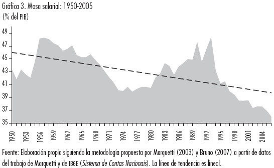 23 Los datos de masa salarial sobre el PIB que ofrecemos en este apartado se obtienen siguiendo la metodología propuesta por Marquetti (2003) y Bruno (2007) a partir de datos del mismo trabajo de Marquetti y de IBGE (Sistema de Contas Nacionais) a los que se ha accedido a través del portal de IPEA (http://www.ipeadata.gov.br/ ).