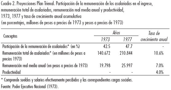 De esta manera se buscaba fomentar una redistribución del ingreso a favor de los asalariados, a partir de un incremento de los salarios reales por encima de la productividad media de la economía,3 previéndose un incremento de los salarios reales del orden del 7% anual acumulativo (Cuadro 2). Asimismo, se preveía una expansión del empleo que suponía el logro de la plena ocupación para el año 1977, proyección que se encontraba estrechamente asociada a las metas de crecimiento económico e inversión.
