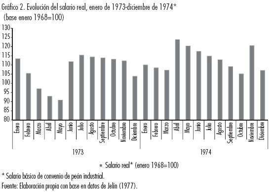En este contexto, la evolución del salario real daba cuenta de una cierta estabilización del mismo en la segunda mitad de 1973, luego de que en el mes de junio, con el incremento inicial en las remuneraciones, se recuperaran los niveles de principios de año. No obstante, a partir de diciembre de dicho año se produjo una reducción del salario real, marco en el cual los sindicatos presionaron y "consiguieron" incrementos, primero a partir de abril de 1974, y luego en noviembre de ese mismo año. Estos últimos lograron mantener el poder adquisitivo del salario solamente, ya que los mismos fueron rápida y crecientemente licuados por el aumento en el nivel de precios (Gráfica 2).
