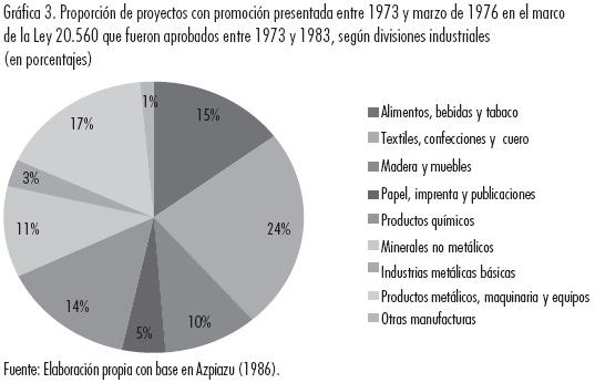 Por su parte, del total de proyectos aprobados entre la promulgación de la Ley N° 20.560 de Promoción Industrial y 1983, la gran mayoría se presentaron en este periodo: entre 1973 y la instauración de la dictadura militar de 1976 se realizaron 277 presentaciones, la gran mayoría de éstas (prácticamente el 80%) durante el año 1974, lo que pone en evidencia el "clima" de inversión generado en el marco de dicha ley. En consonancia con el objetivo de otorgar apoyo estatal a aquellas unidades productivas consideradas prioritarias, cabe destacar la gran proporción de proyectos destinados a industrias productoras de bienes intermedios y de capital (Gráfica 3).10