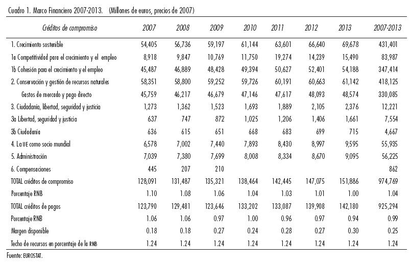 En torno a esta rúbrica conviene tener presente tres consideraciones. Su crecimiento en el Marco Financiero 2007-2013 es cuantioso respecto de la etapa 2000-2006 (25.3%), pero inferior al del Presupuesto total (29.6%), por lo que en el ciclo actual queda mermada la presencia porcentual detentada en 2000-2006 (44.3%). Su crecimiento entre estos dos ciclos es notablemente inferior al de la política de cohesión (33.1%), en conclusión, el Marco Financiero 2007-2013 continúa aminorándose la diferencia entre ambas políticas. Por último, la política agraria, cuyos créditos representan la práctica totalidad de la política de recursos naturales, está inserta desde 2003 en un conjunto de reformas entre cuyos objetivos figura el control del gasto.
