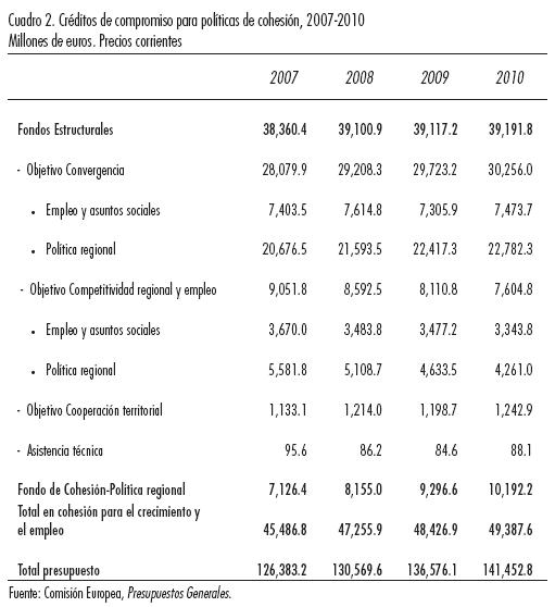 Lo acontecido en los presupuestos anuales para los ejercicios 2007 a 2010 indica que los recursos destinados a acciones estructurales evolucionan de un modo dispar a lo establecido en el Marco Financiero: frente a un incremento del 11.9% del gasto total, los créditos para la cohesión lo hacen el 8.6%, lo que sienta la bases para que su presencia porcentual descienda del 36% en 2007 al 34.9 en 2010. En la primera mitad del Marco Financiero 2007-2013 los créditos para la cohesión experimentan un significativo aumento en términos absolutos, pero una caída porcentual también significativa (Cuadro 2).