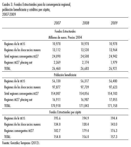Comparando los FFEE por población beneficiaria en las regiones convergentes de la ue15 en 2003 y de la UE27 en 2009,7 a precios constantes de 2004, observamos tal disminución (Cuadro 3). En 2003, los FFEE por población beneficiaria se elevan a 197.1 euros per cápita en tales regiones, mientras que en 2009 son 157.3 euros. La inquietud que despierta esta reducción se amplía al considerar dos hechos. Uno es que buena parte de la población beneficiaria en 2009 tiene una renta per cápita muy inferior a la del 2003 al pertenecer ésa, en gran medida, a socios incorporados en 2004 y 2007. El segundo hecho no es menos preocupante: en 2009, los FFEE por población beneficiaria ascienden a 194.4 euros per cápita en las regiones de la antigua ue15 y a 143.0 euros en las regiones de los doce socios nuevos, pese a disponer de una renta per cápita sensiblemente inferior que las primeras. Tal como hemos apuntado en otras oportunidades (González Temprano, 2012), los FFEE por población beneficiaria en la UE27 no siempre se corresponden con el nivel de renta de las regiones receptoras, algo que no puede dejar de sorprender si consideramos que una de las metas prioritarias de estos créditos es una Europa regionalmente más armónica.