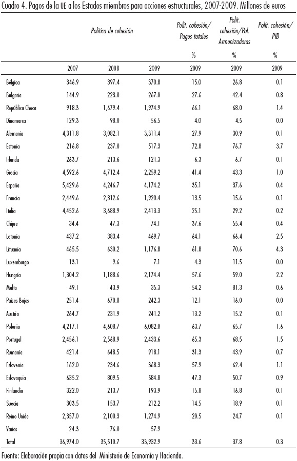 Según esta nota y la vocación redistributiva de la política de cohesión, los pagos de ésta se hallan concentrados en las catorce economías rezagadas o países-cohesión: en 2009, son el destino del 57% de dichos recursos, cuando su población representa el 25.1% de la UE27. El rasgo redistributivo de dichos pagos se observa con particular nitidez en los países cuyo territorio es convergente en su totalidad: Bulgaria, Estonia, Letonia, Lituania, Malta, Polonia, Rumanía y Eslovaquia. Exceptuando Bulgaria y Rumanía por no haber entrado en funcionamiento todos los mecanismos de integración, los cinco países restantes son en 2009 el destino del 26.1% de pagos para políticas de cohesión, mientras que su población sólo representa el 10.2% de la UE27; la otra cara de la moneda son España, Grecia y Portugal: en esa misma fecha reciben el 26.1% de los citados pagos y su población significa el 13.6% de la UE27, pero con una renta per cápita superior a la de esas cinco economías.