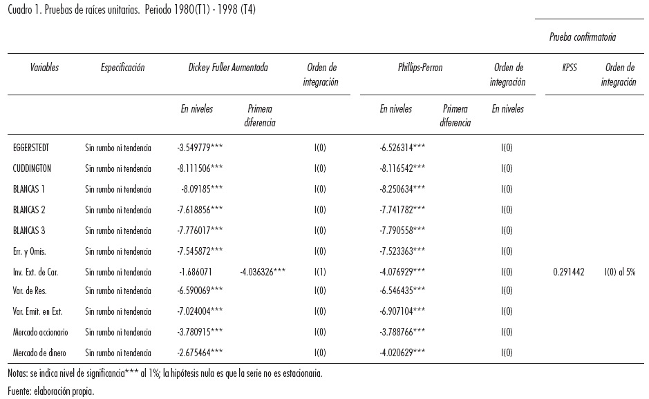 De acuerdo con el cuadro 1, todas las variables fueron estacionarias en niveles, sin presentar rumbo ni tendencia. Por lo cual, todas las variables que se relacionan con la fuga de capitales resultaron adecuadas para el análisis de cointegración, pues presentan el mismo grado de integración. Con la excepción de la inversión extranjera de cartera que presentó estacionalidad en crecimiento (primera diferencia) para el caso de Dickey-Fuller aumentada, por lo cual se aplicó la prueba KPSS como confirmatoria.