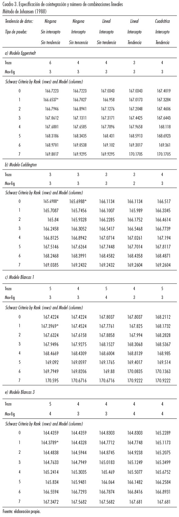 El modelo con corrector de errores en (2) señala tres rezagos (p-1) para las mediciones de fuga de capitales. De forma seguida se escogió la especificación para cada modelo con base en la minimización del criterio de Scharwz, mismo que señaló cointegración sin tendencia y sin intercepto para todos los casos.