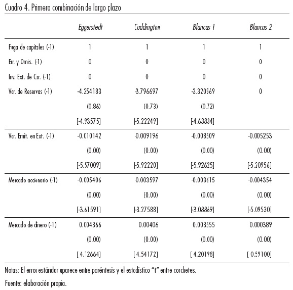 La primera combinación de largo plazo, considerando a la fuga de capitales como variable dependiente, señaló que esta variable se relacionó de forma positiva con las variaciones de reservas, variación de valores emitidos en el extranjero y con el mercado accionario; finalmente, se relacionó de forma negativa con el mercado dinero (véase cuadro 4).5