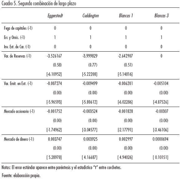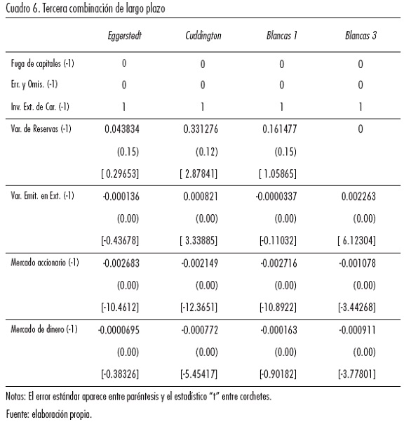 La segunda combinación se realizó con base en errores y omisiones que se asoció positivamente con la variación de reservas, con la variación de valores emitidos en el extranjero y con el mercado accionario (el valor del estadístico "t" no fue significativo en todos los casos) y negativamente con el mercado de dinero (véase cuadro 5).
