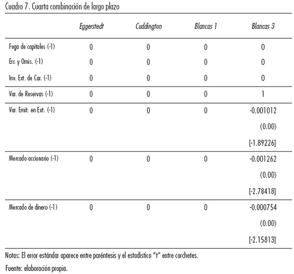 4 No se estimaron combinaciones lineales para Blancas 2 debido a que en el periodo 1980-1989 la medición de fuga de capitales fue equivalente a errores y omisiones, y por tanto, se obtiene una matriz singular sin solución para el largo plazo.