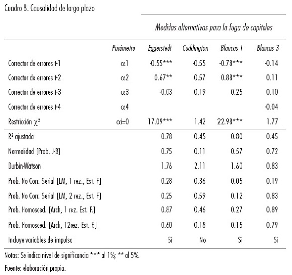 En el cuadro 8 se evalúa la causalidad de largo plazo para la fuga de capitales en cuatro mediciones. De acuerdo a las mediciones de Eggerstedt y Blancas 1, la fuga de capitales responde en el largo plazo frente a los factores determinantes modelados en las combinaciones lineales 1 y 2. Sin embargo, para las mediciones de Cuddington y Blancas 3, la fuga de capitales fue exógenamente débil, en el sentido que no responde a los cambios de largo plazo en las variables modeladas. En suma, no se evidenció una causalidad consistente de largo plazo en todas las mediciones de fuga de capitales.