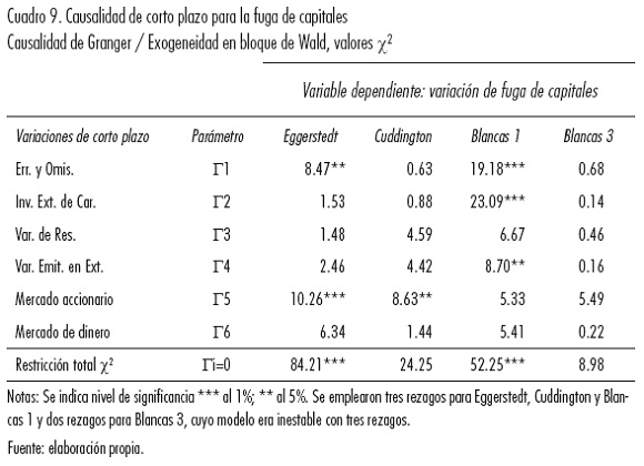 En el cuadro 9 se puede observar que con los métodos de Eggerstedt y Blancas se rechaza la hipótesis nula al 1% de significancia estadística, es decir, se rechaza que las variables explicativas no influyen en el corto plazo sobre la fuga de capitales. Es importante destacar que con el método de Blancas se señala la inversión extranjera de cartera y la variación de emisiones en el extranjero como dos determinantes adicionales de corto plazo. Mientras que en el caso de Eggerstedt y Cuddigton no consideraron estas variables como factores explicativos.