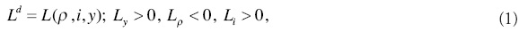 Donde y denota el nivel de ingreso, por lo tanto, la demanda de crédito es en función de la tasa de interés de los bonos, del nivel de ingreso y de la tasa de interés del crédito. La ecuación (1) indica que un mayor nivel de ingreso genera un aumento en la demanda de préstamos, mientras que un incremento en la tasa de interés del crédito desincentiva la demanda de éste, y finalmente un incremento en la tasa de interés de los bonos produce un aumento en la demanda de crédito.
