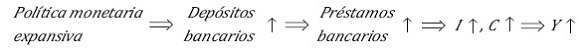 El canal del crédito funciona de la siguiente manera: una política monetaria expansiva incrementa los depósitos bancarios y con esto asciende la cantidad disponible para los préstamos bancarios, lo que genera un aumento en la inversión, el consumo de bienes duraderos y el producto agregado. La cadena de eventos se describe a continuación.
