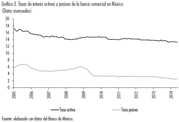 Para un sistema bancario competitivo, Bernanke (1983: 263) define el costo de intermediación del crédito (CCI) como el costo de canalizar fondos desde los ahorradores prestadores hasta las manos de los buenos prestatarios. El CCI incluye la proyección, monitoreo y los costos de contabilidad, así como las pérdidas esperadas ocasionadas por los malos prestatarios. Los bancos presumiblemente eligen procedimientos operativos que minimizan el CCI. Sin embargo, en un sistema bancario de competencia imperfecta como el que opera en México el costo de intermediación del crédito es muy alto, este lo podemos aproximar como la diferencia entre las tasas de interés activas (en este caso tomamos, para ejemplificar, la tasa de interés del crédito a los hogares) y pasivas (costo de captación promedio). El periodo que analizamos es de enero de 2005 a mayo de 2014, como se muestra en la gráfica 3 la brecha entre la tasa activa y pasiva es muy alta; de acuerdo con los datos del Banco de México, de 2005 a 2008 se ubicó en promedio en 9.66 %, para ascender a 10.76% de 2009 a 2014, ajuste que refleja la mayor percepción de riesgo asociada con la crisis financiera mundial de 2008-2009.