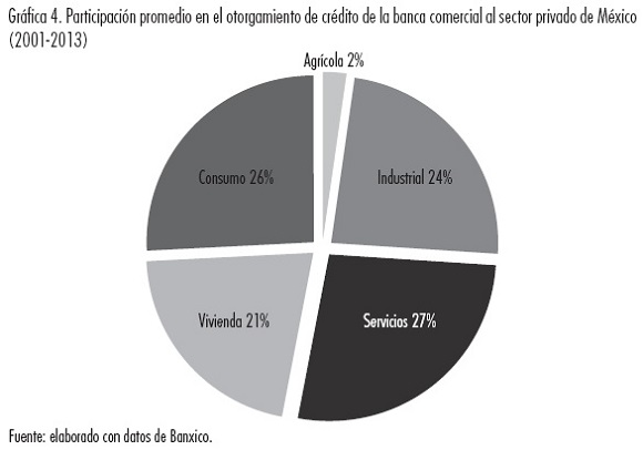 El destino de los créditos otorgados es un elemento que indica las preferencias de los bancos; parte del control que tienen sobre el mercado se refleja en la capacidad de decisión sobre el otorgamiento de crédito sólo a ciertas industrias. De 2001 a 2013 el monto del crédito de la banca comercial al sector privado del país es de 1,321,151.2 millones de pesos, de los cuales sólo el 2.26% fue destinado al sector agrícola (el cual se ve severamente castigado), mientras que el sector servicios recibió 27.0% del crédito total, como se muestra en la gráfica 4.