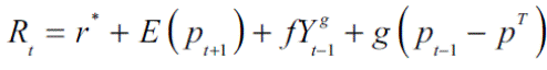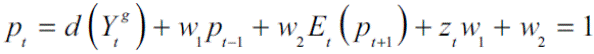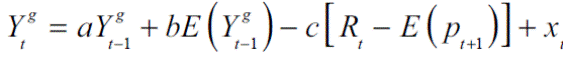 Donde Yg es el porcentaje que mide la brecha entre producto real y producto potencial, R es igual a la tasa de interés nominal, r* es la tasa de interés de equilibrio, p es igual a la inflación pT es la meta de inflación, x y z representan shocks estocásticos, E las expectativas y por último d, w, f, g, son coeficientes, todos ellos con signo positivo. En la ecuación (1) está, según Meyer (2001) una versión dinámica de la curva IS del modelo de Hicks, donde el nivel de producto (que en este caso es la brecha de producto) depende de la tasa de interés. En la ecuación (2) se relaciona la inflación con la brecha del producto, lo que representa la curva de Phillips. Por último, la ecuación (3) expresa una regla de política monetaria.