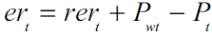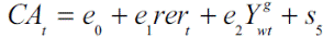 En términos de notación Yg , R, p, pT , E, tienen el mismo significado que en el modelo anterior de tres ecuaciones. Yg w es la brecha de producto del mundo, Rw , pw , son la tasa de interés nominal y la inflación internacionales respectivamente, RR* es la tasa de interés consistente con la brecha de producto cuando ésta es igual a cero, lo que significa que en la ecuación dos la tasa de inflación es constante (Arestis, 2009: 4). Adicionalmente, rer representa el tipo de cambio real y er el tipo de cambio nominal medido por la moneda extranjera en términos de la moneda local, Pw es el nivel en logaritmos de los precios internacionales, CA es la cuenta corriente de la balanza de pagos y s1 , s2 , s3 indican los shocks estocásticos. Las variaciones en el tipo de cambio nominal derivado de la ecuación nueve se formula como: ∆ ert = ∆ rert + Pwt − Pt