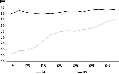 4The case of MESA is similar, although with lower growth in production and the relationship between B/K - I/K is weaker than in these two sectors. It is also relevant to note that although the participation of this sector in total GAV was 3% in 2007, its share in total profit was nearly double due to the importance of big electrical companies.